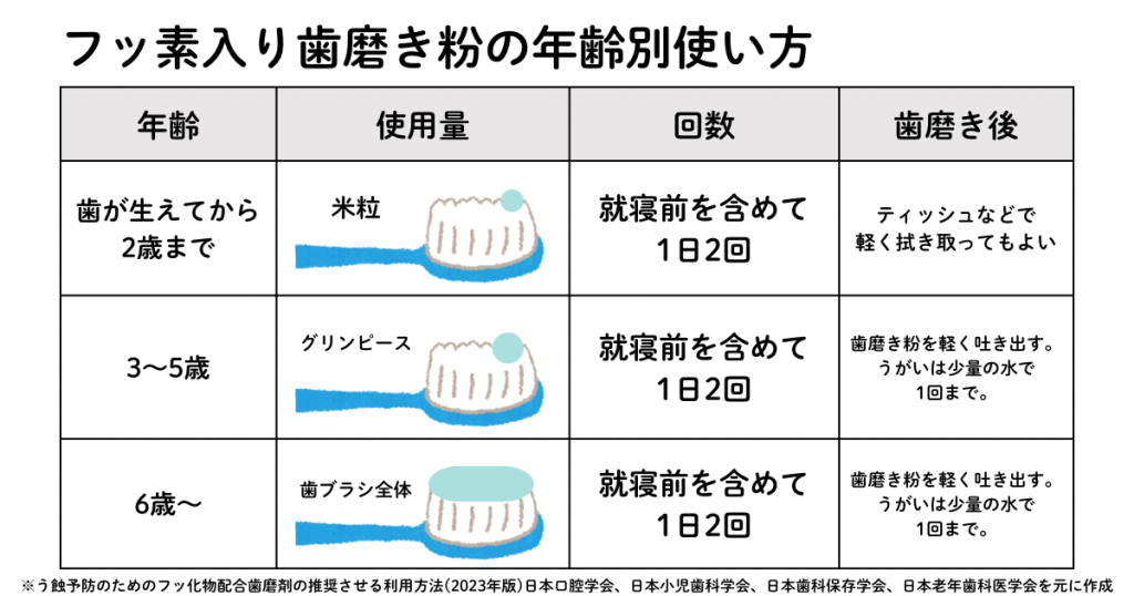 たわちゃん先生歯磨き粉に含まれるフッ素濃度は、6歳以上用は1,000~1,500ppm、6歳未満用は500~1000 ppmが多いです!