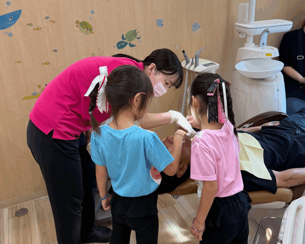 そのサービスの一つである「お口のドクター」は、子ども達が歯科医師として「問診」「視診」「予防処置」の一連の流れを体験できる、予防歯科に特化した職業体験プログラムです。子ども同士や子どもと保護者で「先生役」「患者役」となり、患者情報の聞き取りから染め出しでの歯磨き指導まで行います。